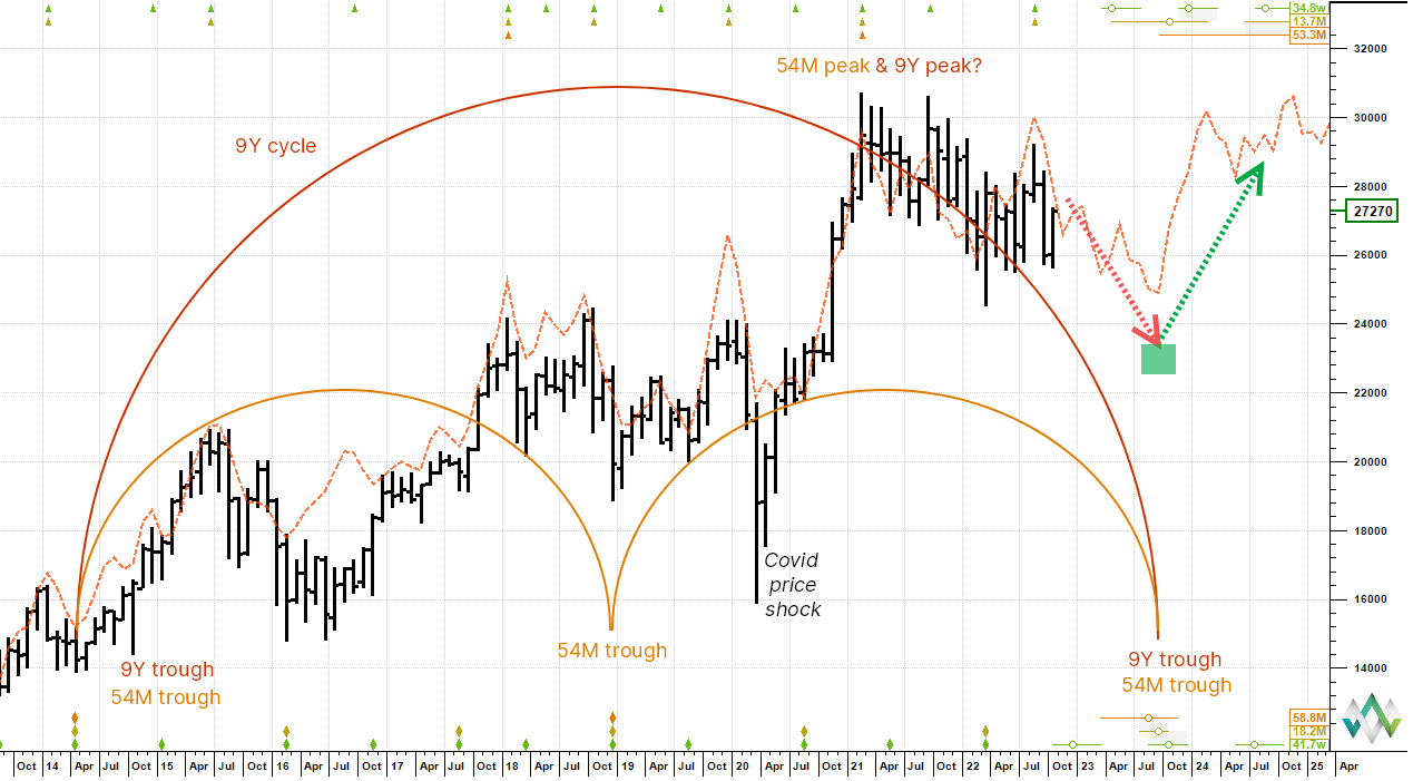 Monthly data going back to April 2014, which is likely where the current 9 year cycle began. The 54 month cycle as well as potentially the 9 year cycle topped in February 2021. Both cycles' status is down and the next trough is not expected until next August circa 23,000. The broad price path is therefore down. The synthetic composite cycle line projects the anticipated trajectory. Note: one would have expected the 54 month cycle to have troughed mid-chart in March 2020. However, the cycles analysis places the trough in December 2018. The big dip is a fundamental price shock (Covid), which temporarily threw the cycles out of kilter.