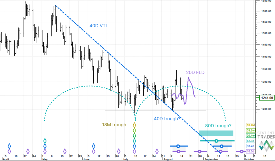 Price is currently testing the 20 day FLD and a clean break here puts us falling into an 80 day cycle trough due in the second weak of September and below 1,100. We would be expect to see a muted reaction higher but then a continuation lower with the likelihood that troughs come in late and lead to weak rallies and quick failures going forward.