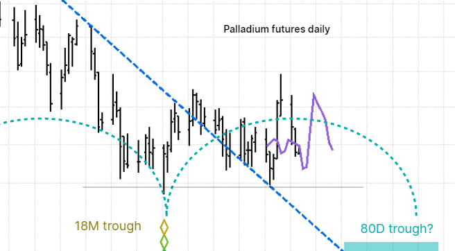 If price breaks below 1,185 (the ostensible 18 month cycle trough price low), then we should consider a bearish scenario, after all it suggests that the 18 month cycle has peaked and is falling. At this stage a case can be made for this bearish scenario to play out. The 40 day cycle looks to have bottomed and then quickly peaked and then crashed again.
