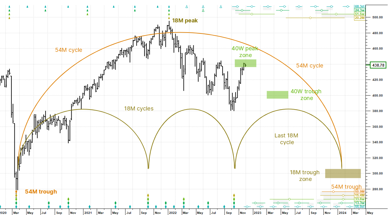 Analysis: the last 54 month cycle trough was March 2020 and the next is due at the end of 2023. This is the so called Business Cycle and it consists of three 18 month cycles (and bear in mind that the usual harmonic ratio with adjacent magnitude cycles is 2:1 rather than 3:1 - the 54 month cycle for our purposes is unique).