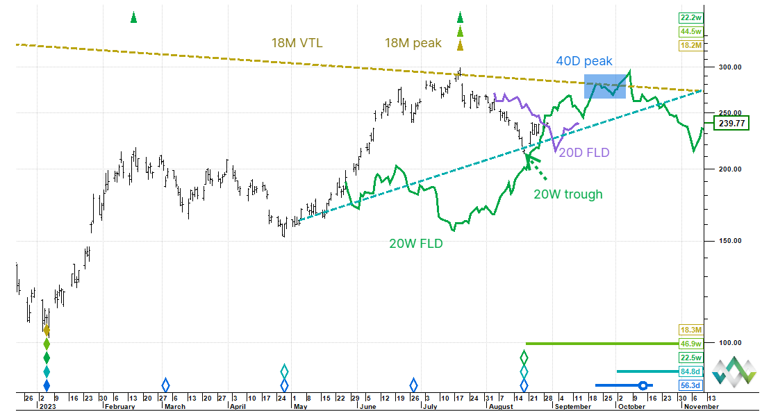 The first chart below is the original call on 29 August: a new 20 week cycle starts up and looking for 40 day cycle peak at down-sloping 18 month VTL circa 280.