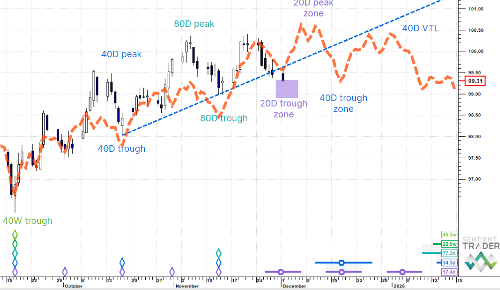The underlying trend is up, but the 80 day cycle peak is now in place. We are looking for a 20 day cycle trough zone, potentially this week, and then another push higher to the next 20 day cycle peak.