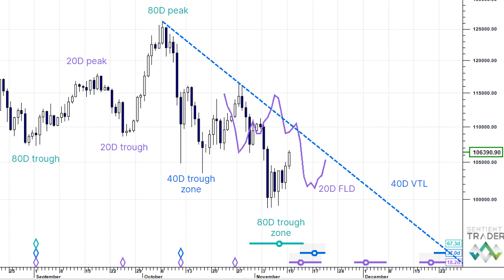 Converging with equity risk, Bitcoin may have just passed through an 80 day cycle trough. But because the last 80 day cycle trough was higher, we are viewing the current move as counter-trend.