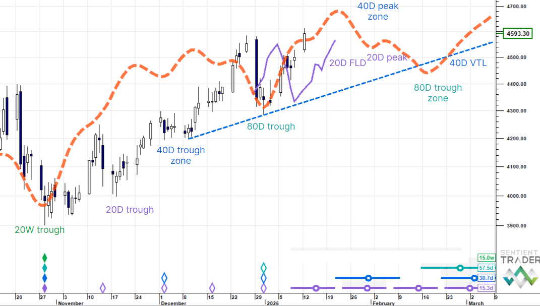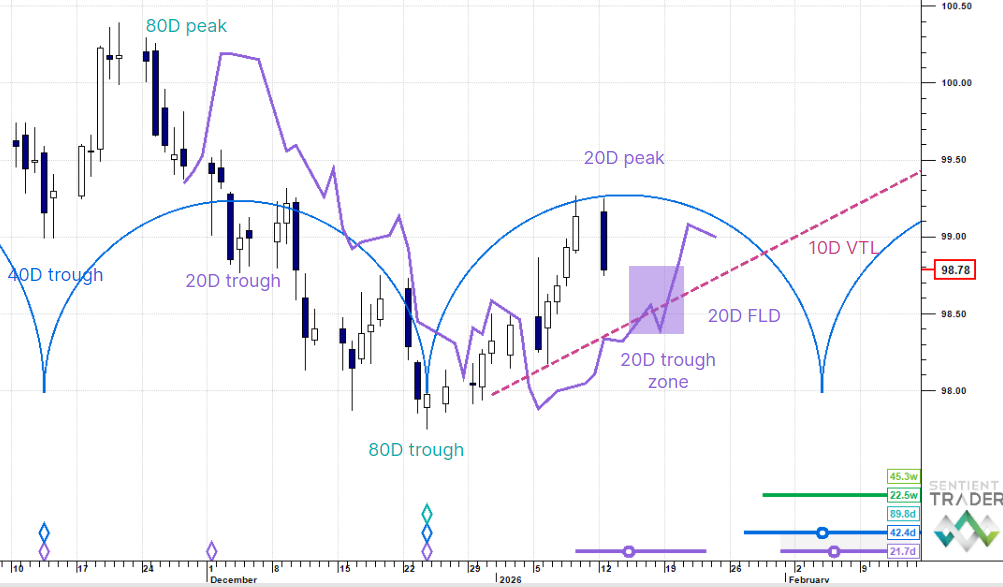 The first 20 day cycle peak in the new 80 day cycle looks to be in. Looking for counter-trend drop to 20 day cycle trough.