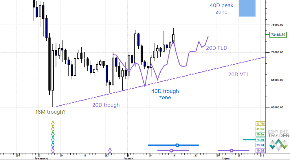Although the 40 day cycle trough is not very clear, we look to have passed through it and should continue higher with the new 18 month cycle upswing serving as a tailwind.