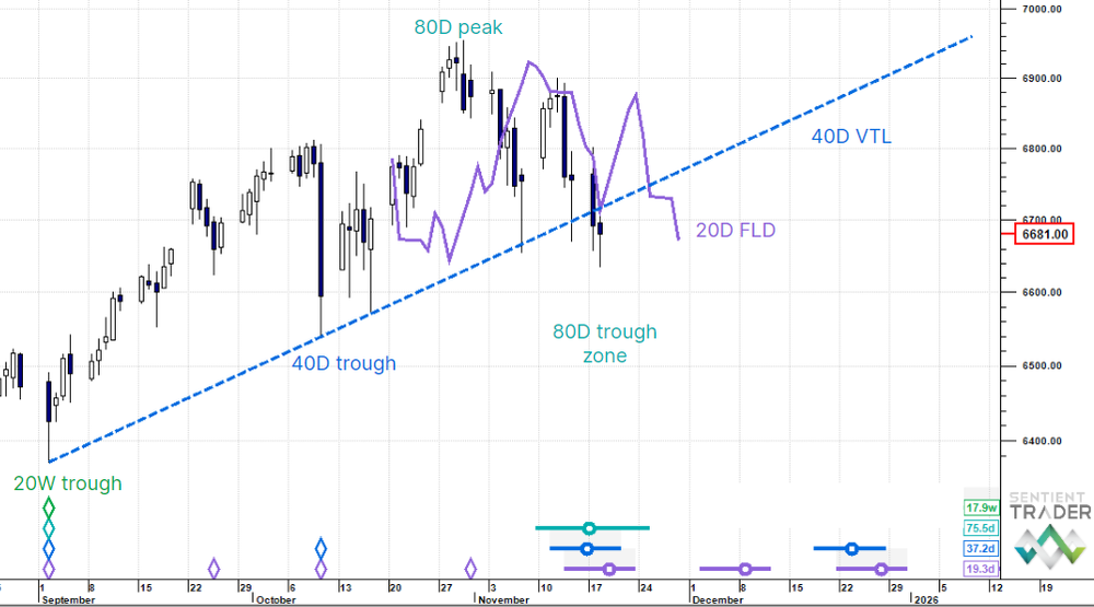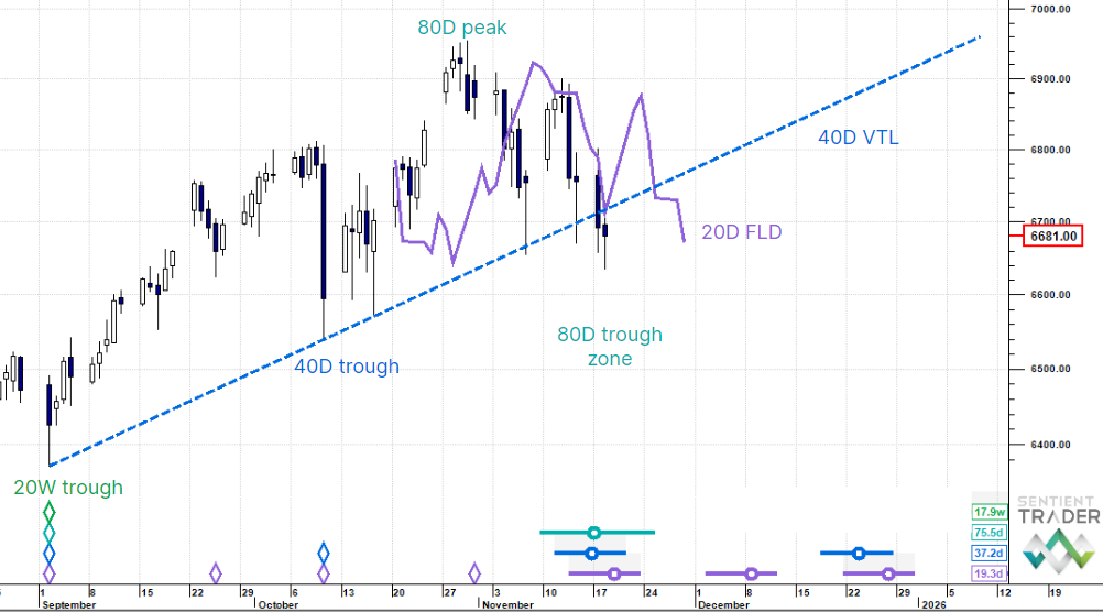 The new 80 day cycle upswing has collapsed, which is bearish. Price is in the vicinity of a 20 day cycle trough, but we are expecting a weak rally out of it and then more downside.