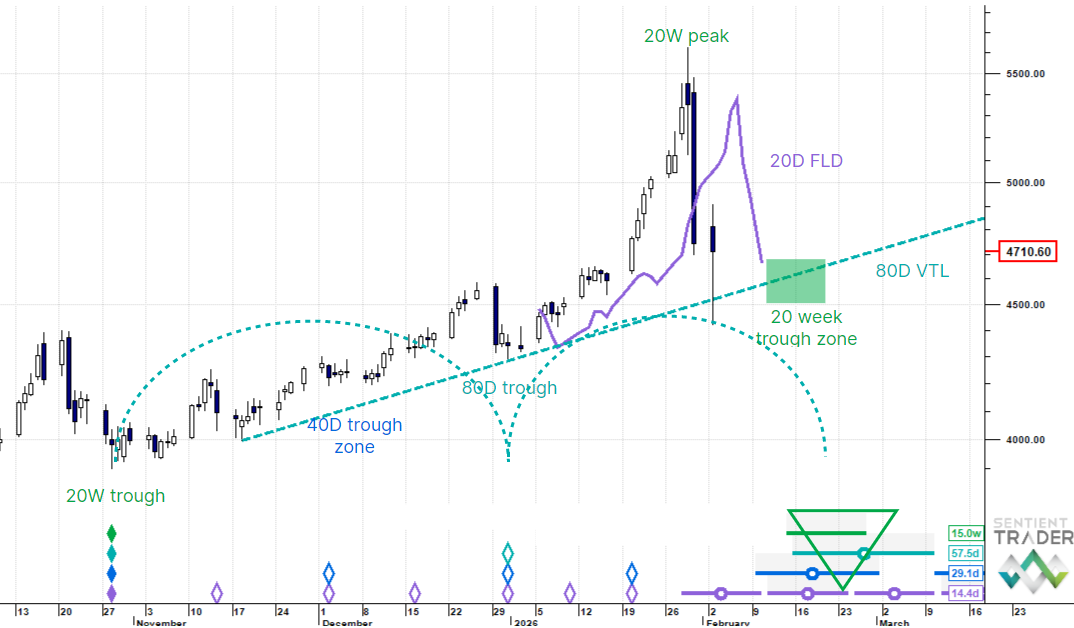 Gold has flash crashed into the 80 day VTL and the range of the 20 day cycle trough. We expect a minor bounce but the major trough of the 20 week cycle still lies just lower around mid month.