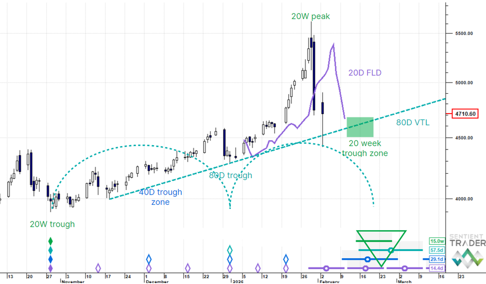 Gold - 20 week cycle trough still ahead of us. Small Up to Down.