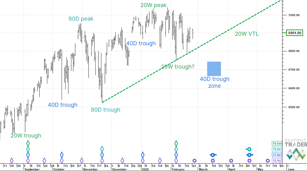 Even though a major trough looks to have just passed, the analysis suggests that we need to work lower for the next 40 day cycle trough. This would mean the 20 week VTL breaks and that the 20 week cycle peak becomes the 40 week cycle peak.