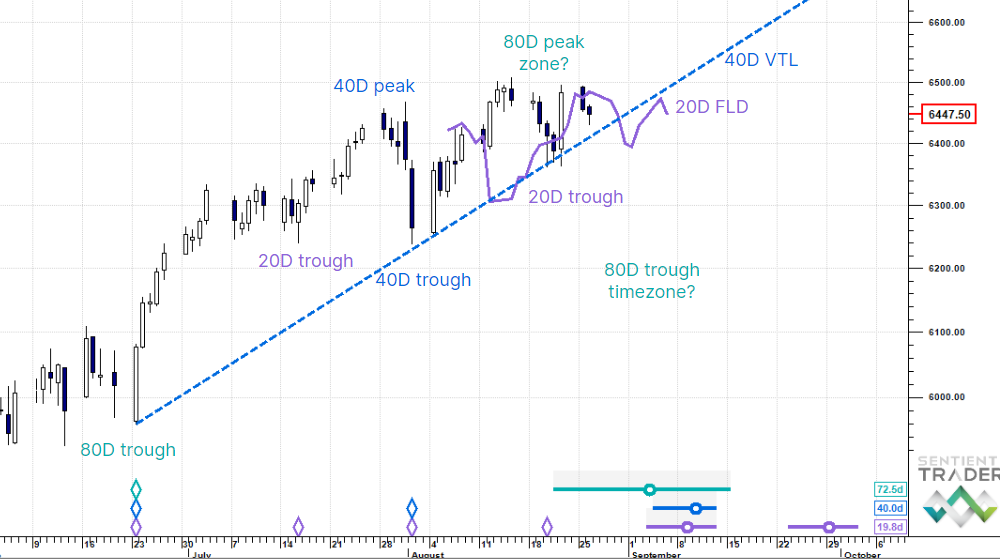 There are multiple different analyses for the E-Minis at the moment, but the one we favour is that price is struggling in an 80 day cycle peak. A down-cross of the 40 day VTL at around 6,400 and change confirms.