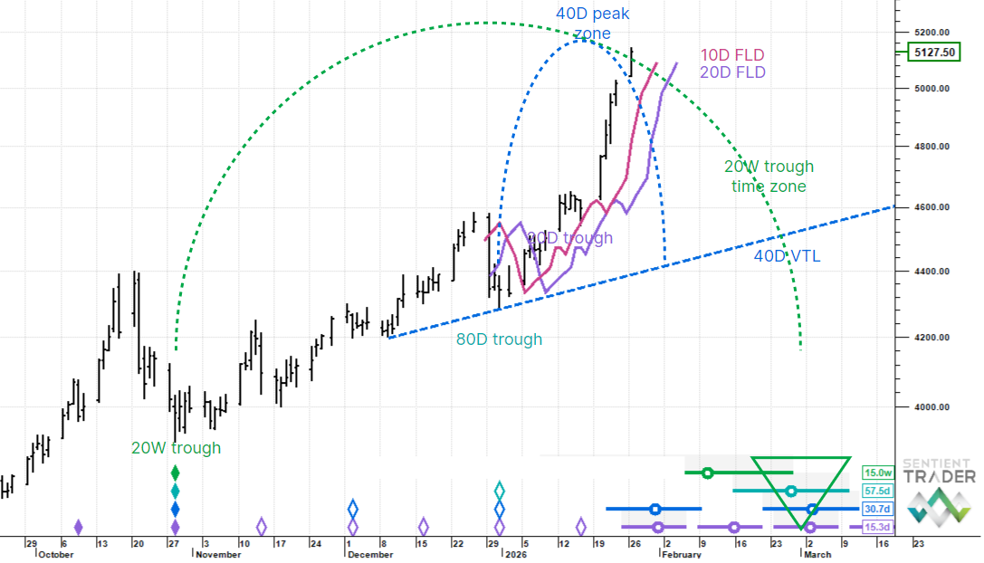 Gold is probing a 40 day cycle peak zone, but we do not expect this to result in a full throated pullback. Rather, the wave structure suggests a straggly sideways move (wave 4 of 5 in Elliott terms) and then another push higher. There is too much parabolic power to ask for a steep retracement. What we are looking for afterwards is a push towards the 20 week cycle peak, the next trough being due in early March. That pullback is likely to be meaningful.