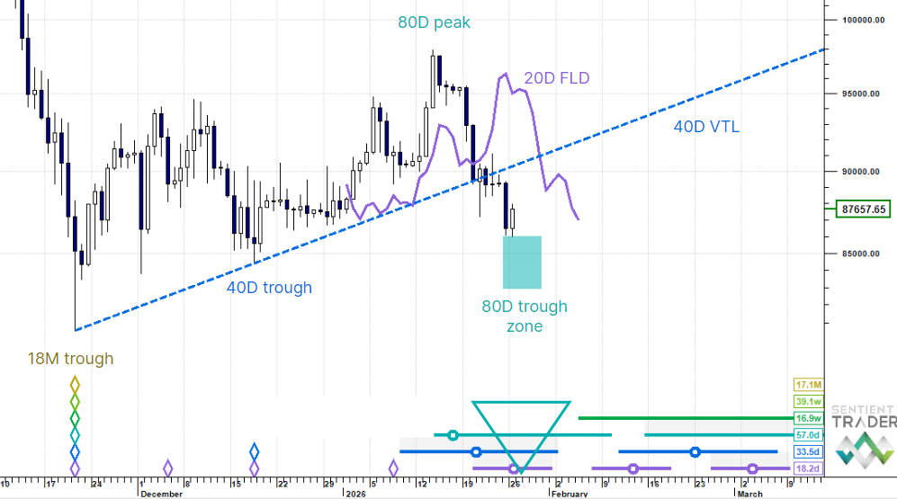 Price has overshot to the downside and the 40 day VTL cross confirms that the 80 day cycle peak is in place (mid January). Price is closing in on an 80 day cycle trough, which is pro-trend because the new 18 month cycle is still rising.