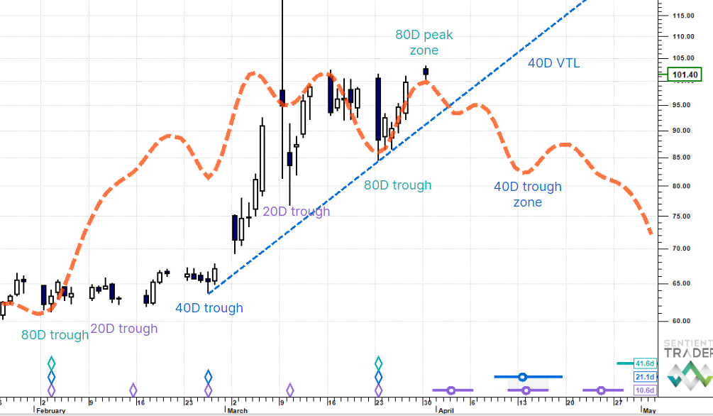 We had another false start on the 80 day cycle trough, but despite geo-political noise are squarely in the time range of the trough now. Expecting an advance shortly.
