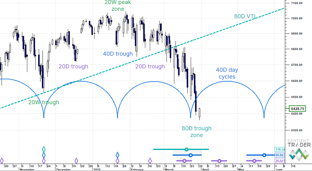 S&P 500 E–Minis (ES) - testing the 80 day cycle trough zone. Up.