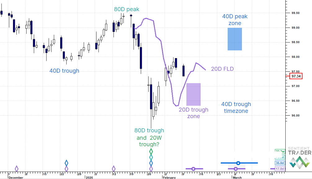 We believe that DXY is in at least a new 80 day cycle upswing. We likely just passed through a 20 day cycle peak and are now looking for the 20 day cycle trough.