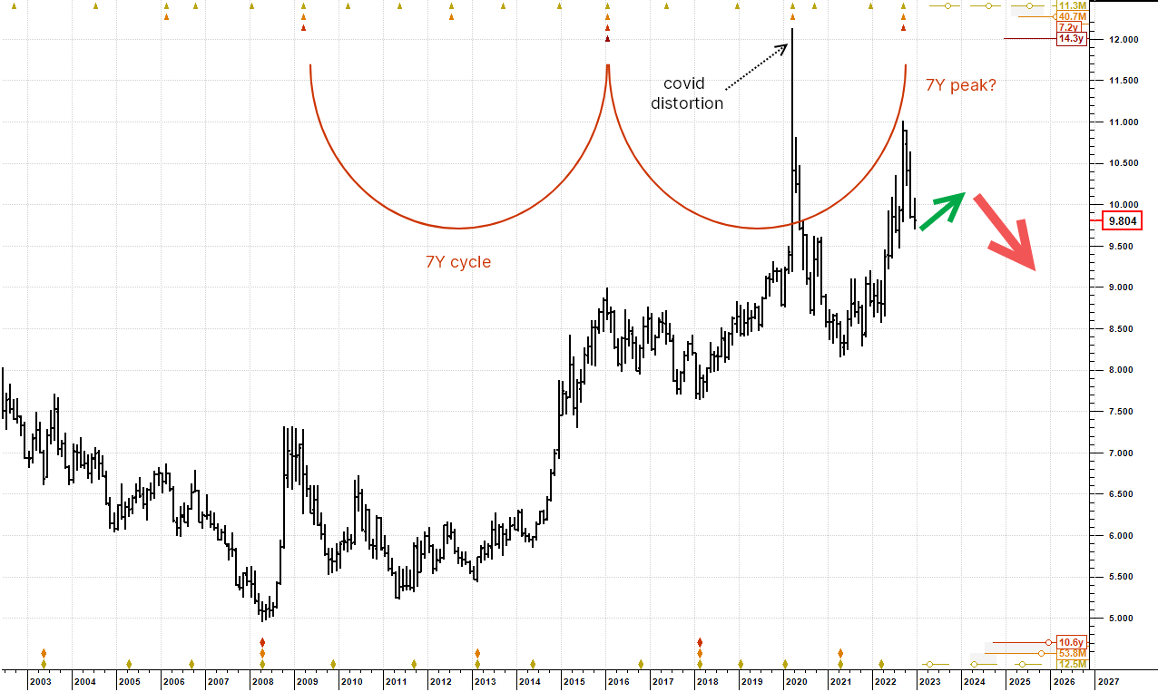 A long term view of the US Dollar against the Norwegian Krone suggests that a peak-synchronized analysis might be more reliable than a trough-synchronized one. And recently the peak analysis has a very regular 7 year rhythm, adding confidence to the analysis despite the model being a little shorter than the default model we apply to stocks. This peak analysis paints bearish broad strokes, warning that a 7 year cycle peak formed at the end of September this year, providing a good deal of bearish pressure into 2024.