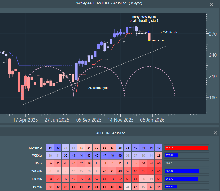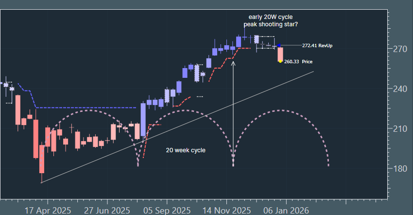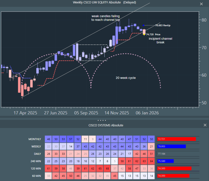 Price is challenging the bottom of the April 2025 channel and the preferred view is that it breaks. The next 20 week cycle trough looks to be early February, so we are assuming a decline into this time-zone. The multi-time window has shown a drop in blue power at the monthly level and note the red bar to the right of the heatmap row. This is full red and has the breakdown to red at 72.7 - the system anticipates breakdowns. Weekly has just turned red and daily and 240 minute have accelerated down. Note the long upper wicks in the chart as they probed and failed to reach the channel top, this shows buyers unable to control the highs, so in that sense, we had a lead indicator on current weakness back in November.