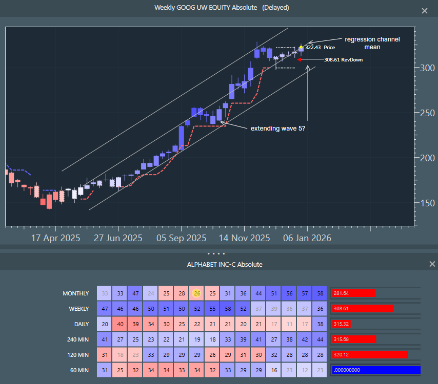 Price has been in a quasi-consolidation for the past four weeks, but is challenging the upside breakout level, which points to a longer uptrend continuation if it pops free. In the multi-timeframe window, we see blues incrementally building power for seven months. There has been a mild deceleration (i.e. early rally 31 to 36 to 44 to 51 to 56 and latter stage 56 to 57 to 58), but there is not enough evidence yet to point to exhaustion. We assume that the longer uptrend is intact and that we are re-joining. Note that the weekly row has broken to non grey blue and daily has just broken to blue. In the chart, price is also challenging the regression mean from April 2025.