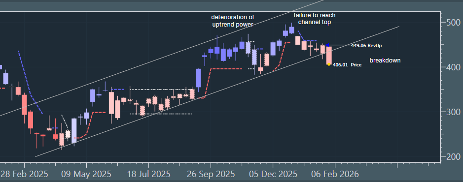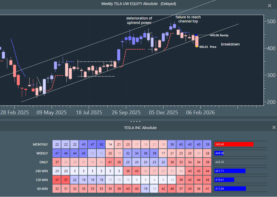 Weekly chart shows trend channel breakdown after significant uptrend deterioration. All timeframes from weekly lower are red down on increasing momentum numbers.