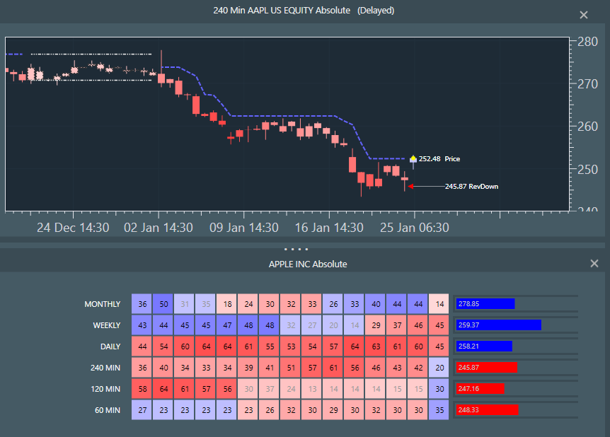 The daily row shows an unwind of downside reds from oversold levels and all intraday timeframes have inflected to blue. We may look at the trade again once clear of earnings.
