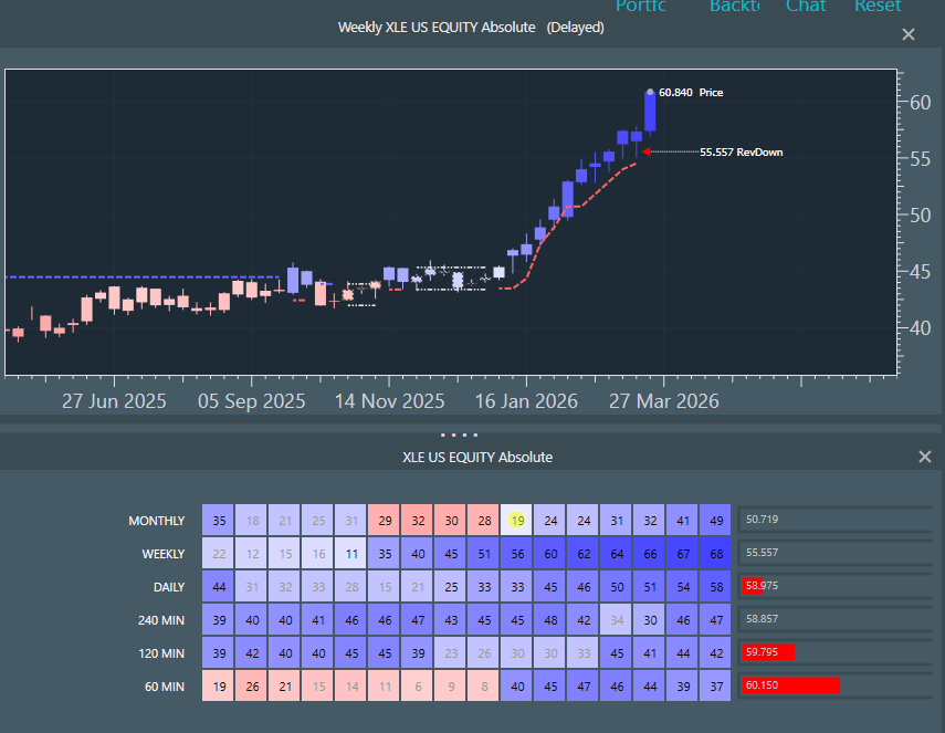 Energy SPDR (XLE) - intermediate term over motivated, lowest timeframes momentum flattening.