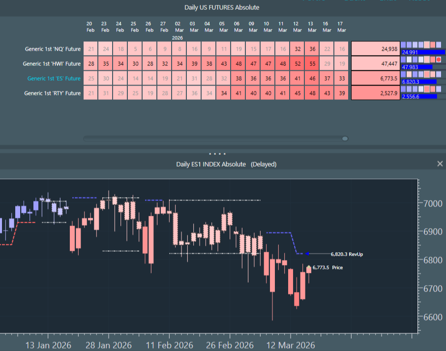 All US Index futures are still red down basis daily data, although we are starting to see lightening reds and lower power numbers indicating a near term unwind of down power. To the right of the heatmap we can see that the risk progress bars are blue and filling up, with NQ (Nasdaq contract) nearly full blue with the risk level at 24,991. These bars show how close price is to its daily upside colour change level (blue in this case).