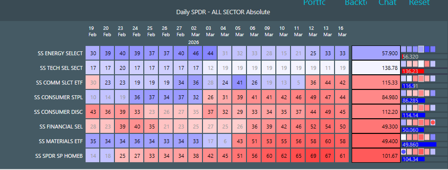 One measure of market breadth at a higher level is the state of blueness of redness (up or down trend direction) across the SPDR Sectors. Here we see mostly strong red down and no meaningful intraday blue power in the mini-matrices. In other words, the sectors are not setting up for a rally phase right now. Energy (XLE) is still at the top, but notice that after the grey blue rest phase (4 to 11 March) price has picked up to full blue uptrend again, but on lesser power that the rally phase that ended 3 March (momentum of 33 versus 44). This is an incipient bearish momentum divergence. But again, its largely news-flow driven at this stage