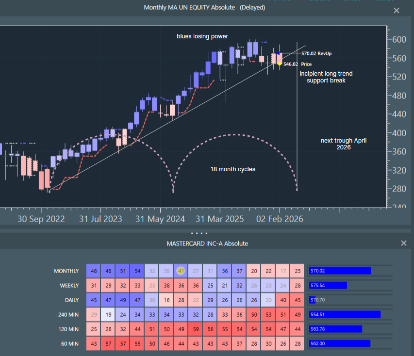 For this one we are focusing on the monthly profile. The low mid chart (July 2024) was an 18 month cycle trough and the next trough is due in April this year. The argument here is that's where price will fall into this date under its own weight. Price is currently testing trend support that has been in place since September 2022. If this conclusively breaks down, which is the preferred view, then the long trend has rotated, consistent with the 18 month cycle having peaked. Monthly blues have steadily been losing power since February 2025 as upside momentum has bled out. Notice in the sub-window, that weekly has just broken to red and that all timeframes are now red.