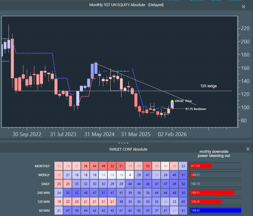 Again focusing on the monthly level, we have just had a break to blue, the first blue since June 2024. There is a key support/resistance ledge around 125 and with all timeframes below monthly blue and thrusting, we think this is a reasonable target and liquidity magnet.