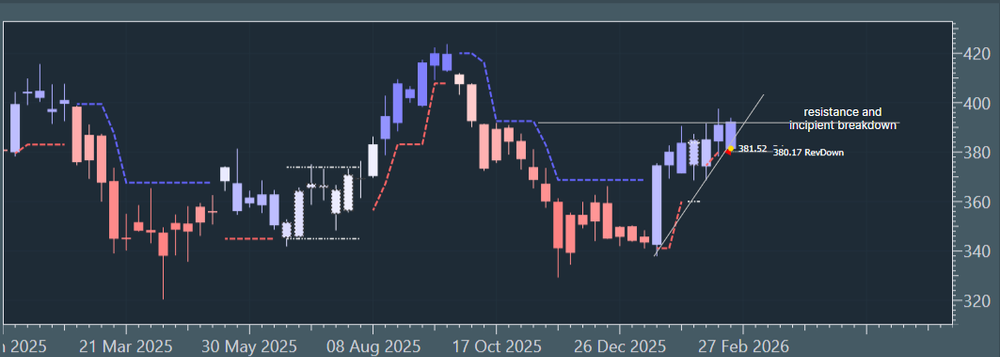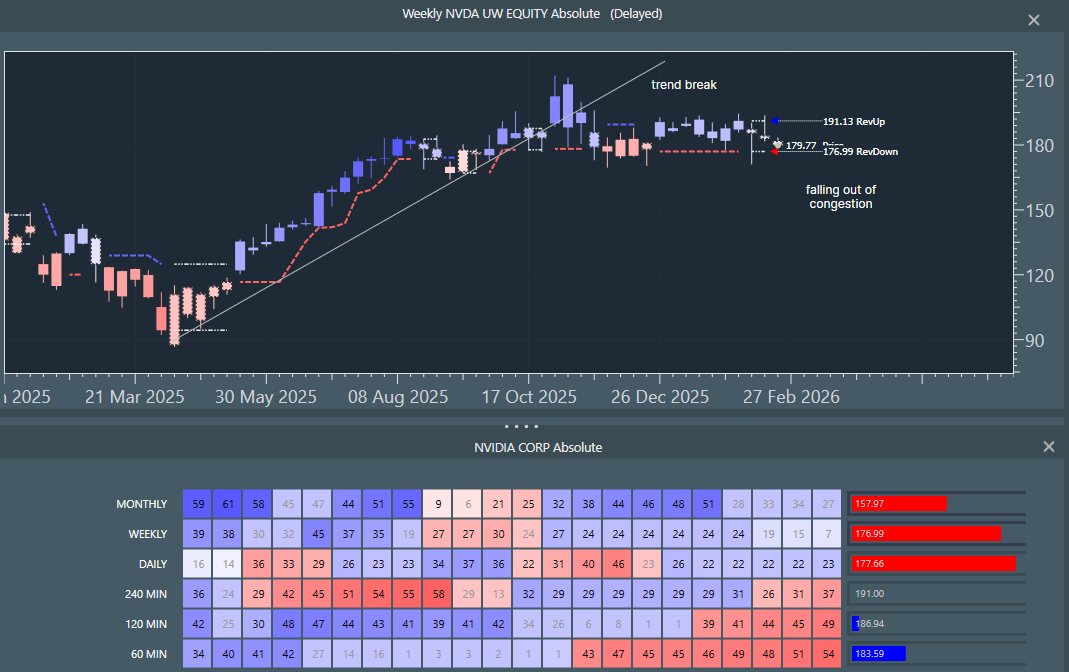 Four months ago NVDA broke the April 2025 trend support line and failed even to make a reaction rally of what in fact was a meaningful cycle low in December. Price then just flat lined on very poor blue power as a residual deep pockets bid held in the market. However, we are now at the bottom of the daily range and the downside risk edge is almost upon us at 176.99. This in fact coincides with the weekly downside risk edge. Meanwhile lower timeframes are red and accelerating on higher momentum numbers and deeper reds.