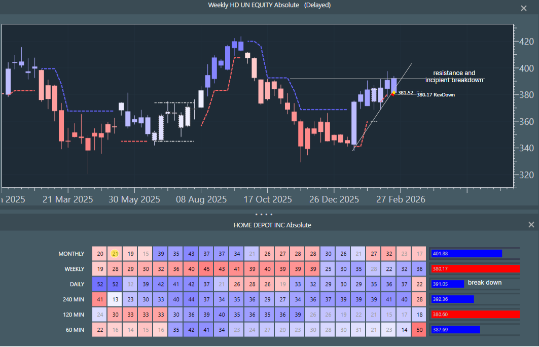 HD hit a key resistance level on weekly after a fairly insipid blue cover rally. Daily has also just turned red.