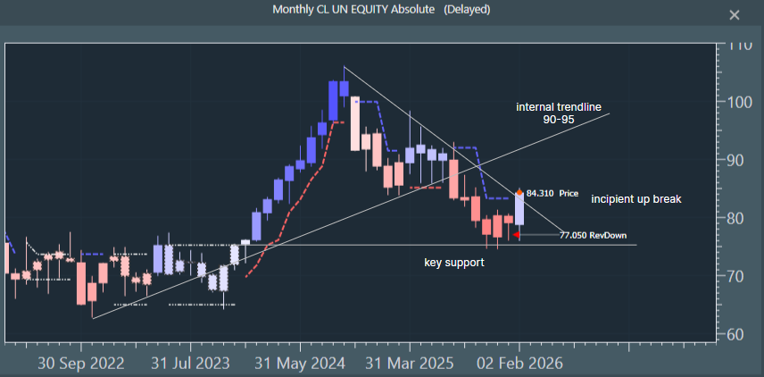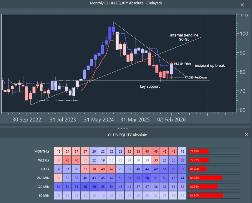 Notes: we tend to focus on inflections on the weekly data level to strip out noise and, hopefully, call trades of more meaningful longevity. The basic system is a dynamic heatmap and colours: Up as Blue and Down as Red. Momentum is woven into the price series, such that paler colours represent lessening of power and stronger colours, increasing power. The sub-window shows the heatmap with momentum numbers at each timeframe from hourly to monthly.