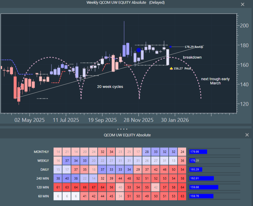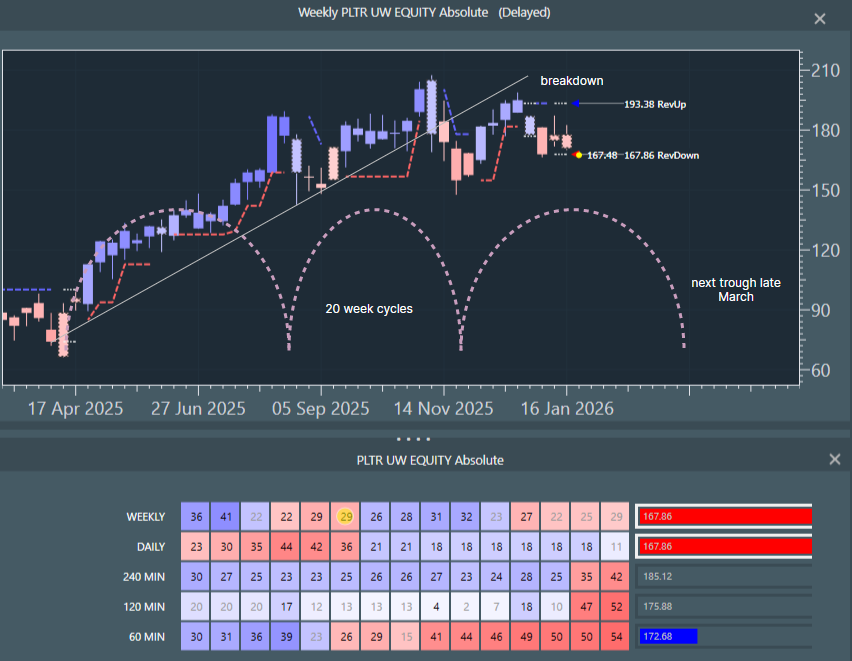 Price broke the May 2025 uptrend last week and has just dropped through the bottom of a multi-week consolidation. This means that the current 20 week cycle topped early and its next trough is not until early March. We will be due an 80 day cycle uplift soon, but we think any rally will peter out fast against the headwind of the falling longer cycle. All timeframes are red down and accelerating.