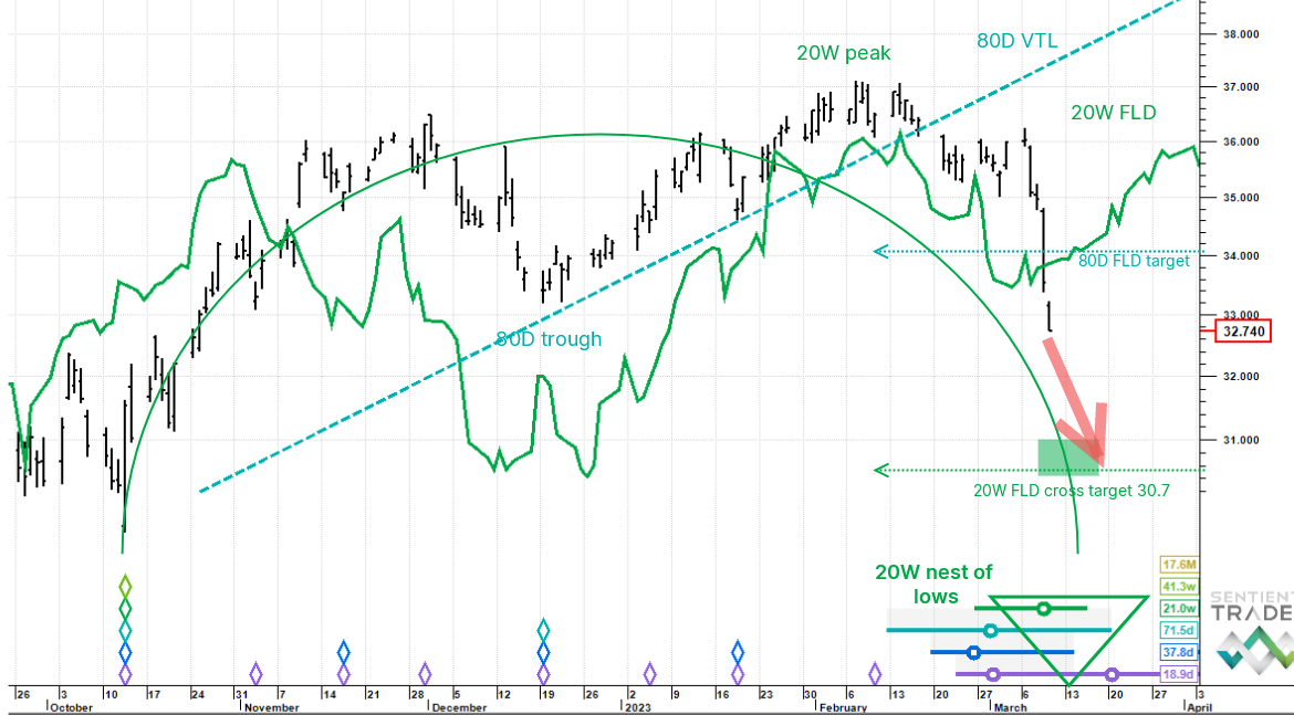 - An 80 day FLD cross (not shown on chart) projected down to 34.5 but this was blown through in the session before last. The 20 week FLD has just started being crossed down and we are assuming it will fully cross giving a downside projection to at least 30.7.